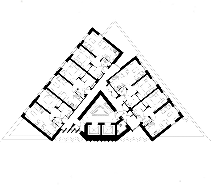 Mapleton Crescent is an iconic 27-storey tower in south London delivered for Pocket Living in just 18 months. It contains a mix of apartment types, 60% of which are affordable. The scheme was originally designed traditionally, but volumetric delivery was key to making the highly constrained 450m² site, bounded by a transportation Red route, a shopping centre and the River Wandle, viable. The tower covers the site’s whole triangular footprint. This was made possible by the innovative construction method, which involved assembling the building from above. The slimline three-sided core provided the base for a single crane to position all 283 fully fitted, loadbearing units in eight weeks, at a rate of eight units a day. Volumetric manufacture accounted for three-quarters of construction, but less than 8% of total construction time.