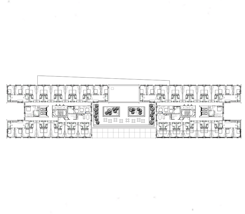 The ground floor in Thurston Road is an open plan layout with a double height colonnade to the street. The use of the open plan layout is typical for student accommodation projects where the requirements for a reception area, recreation room and communal living space are essential. To accommodate this, a split level concrete transfer structure was used to support the modules on level 1 and 2, with the street side being 2 storey to accommodate a change in level to suit the slope across the site. The modules on level 1 were designed as varying height modules so that they could be partially slotted under the transfer structure at the lower end, with the modules at the higher end matching the top of the transfer structure to support the modules above. The modules on level 2 were supported across both the modules and transfer structure, which achieves the required speed and quality, while also providing the flexibility of layout not normally associated with modular construction.